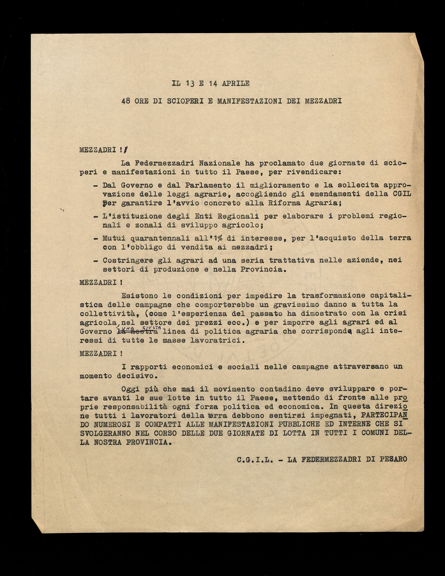 Volantino ciclostilato della Federmezzadri di Pesaro per lo sciopero di 48 ore del 13 e 14 aprile.