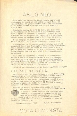 Volantino del PCI di Fossombrone sulla richiesta di un asilo nido con riferimento alle lotte delle operaie della CIA.