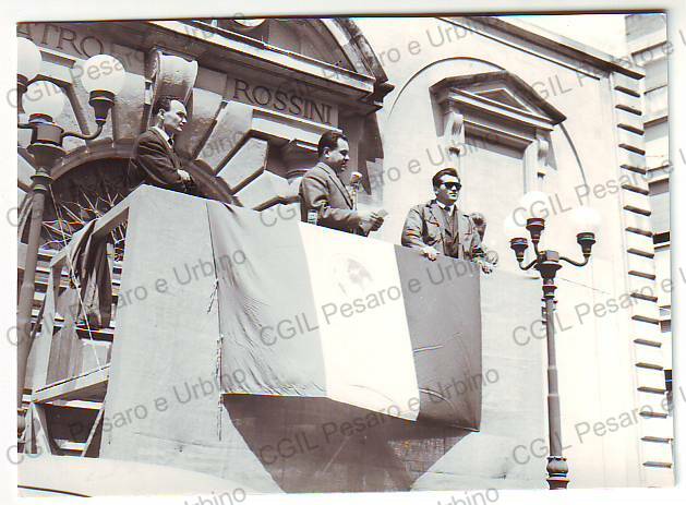 Manifestazione e comizio in Piazzale Lazzariri con palco davanti al Teatro Rossini. Sul palco a destra dell'oratore Aldo Bianchi e alla sua sinistra Lino Mengucci.