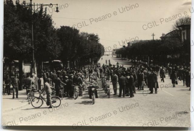 Motociclette e motorini i fila in Viale della Repubblica a Pesaro.