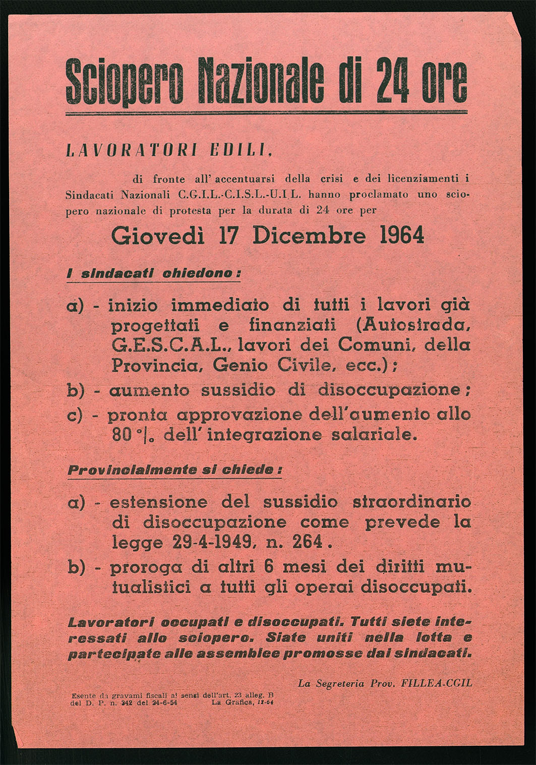Volantino della Segreteria Fillea-Cgil per lo sciopero di 24 ore del 17 dicembre 1964 dei lavoratori edili.