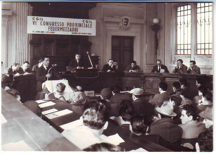 Fotografia del VI Congresso provinciale della Federmezzadri, tenuto a Pesaro nella Sala del consiglio provinciale. Presiede Luigi Manna.